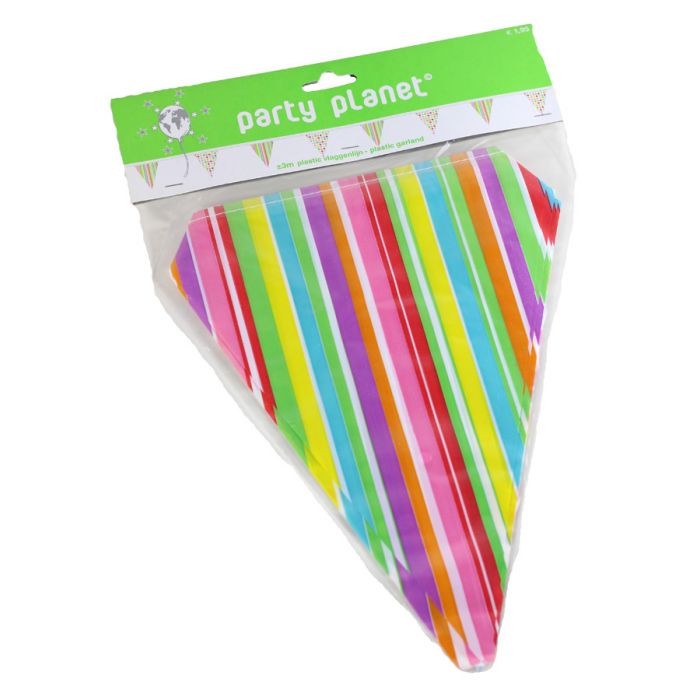 Omschrijving | Deze vlaggenlijn van 3m is van het merk Party Planet. De ene zijde is gestreept, de andere zijde is vrolijk gespikkeld. Deze leuke vlaggetjes passen op elk feestje. |